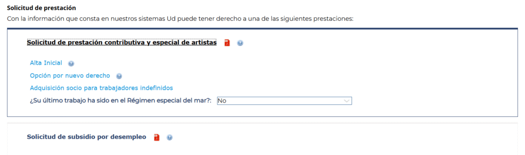 Vas a hacer click en «Solicitud de prestacion contributiva y especial de artistas» Si, suena confuso pero lo que quiere decir es que en ese link tenes la prestación contributiva, osea el paro, y la solicitud especial de artistas. Dos cosas en un solo link.