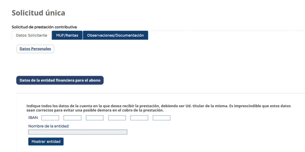 Cuando entres verás tus datos personales y debajo el IBAN donde queres recibir el paro. Completalo con el número y luego hace click en «Mostrar entidad»: lo que aparece ahí debería coincidir con tu banco. (Santander, BBVA, Caixa, etc)