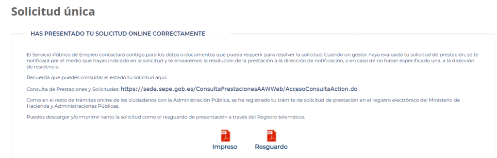 Baja el resguardo y el impreso de solicitud. Te avisarán por mail o msj si te aprueban o no el paro, si necesitan más información para decidir, etc. En la misma semana que subis los papeles deberías tener una respuesta. Si todo sale bien (que debería), el día 10 del mes siguiente estarás cobrando el paro.