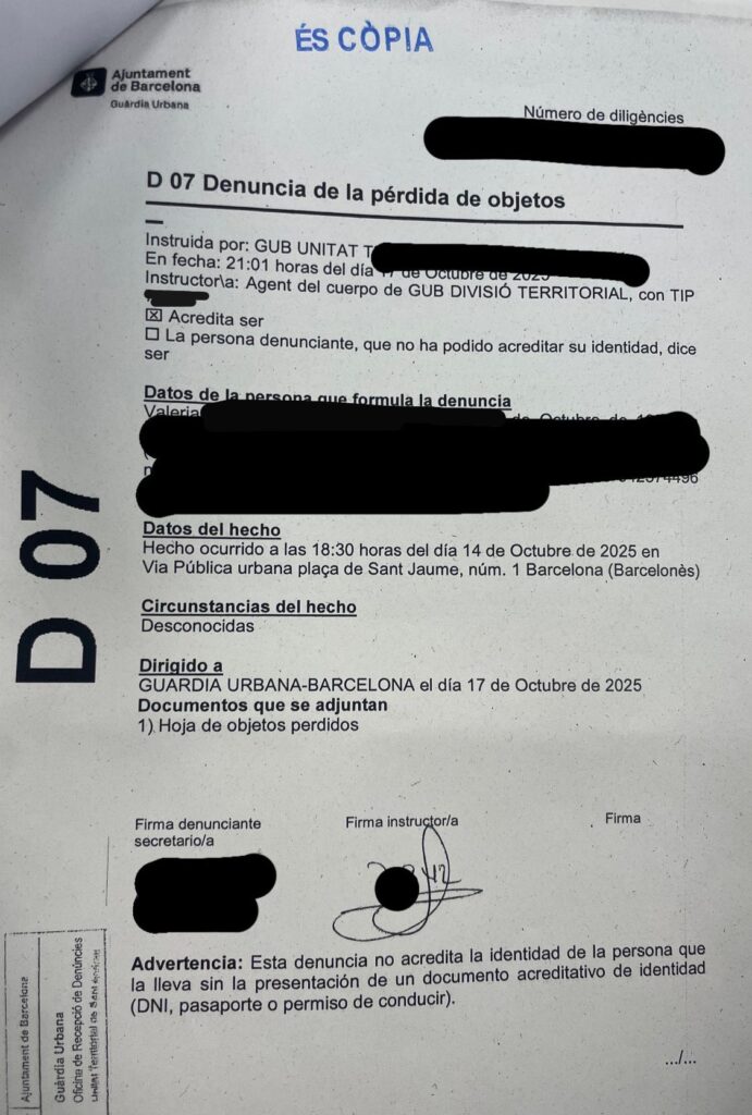 Después de realizar estos pasos básicos, lo que tenes que hacer es la denuncia en policia. Fui a una que me quedaba cerca de casa con otro ID (uno que tenga foto) y me tomaron la denuncia. Tardaron un rato en atenderme así que vayan con paciencia. Te dan unas hojas que te sirven en el caso de que en algun lugar tengas que justificar porque no tenes tu NIE verde. Pero ojo, no podes estar meses y meses con esto en «reemplazo» del NIE verde / CUE.